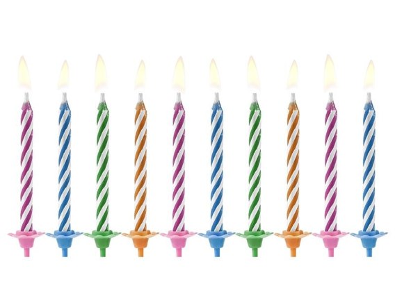 Świeczki urodzinowe Magiczne, po zdmuchnięciu gasną, po czym zapalają się ponownie, mix kolorów, rozmiar ok. 6 cm, w zestawie 10 świeczek i 10 podstawek.