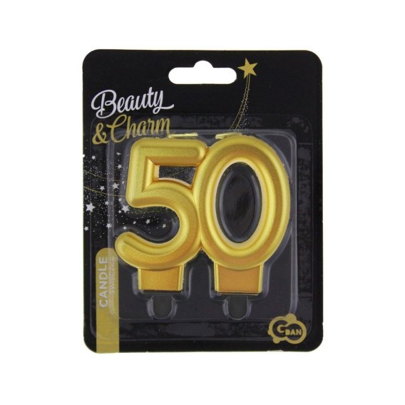 Świeczka cyferka 50 w kolorze złotym, idealna na osiemnaste urodziny. Wysokość: 8 cm.