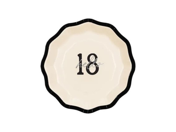 Talerzyki papierowe ''Hello 18''. Kremowe talerzyki na 18 urodziny z czarnymi elementami i srebrnym, błyszczącym napisem Hello. Mix kolorów, średnica około 18 cm.