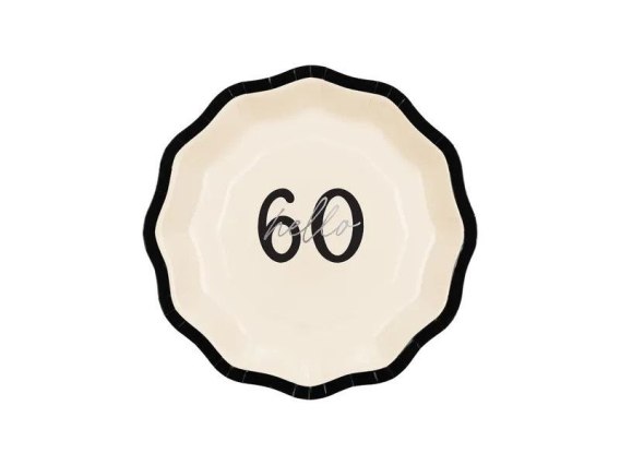 Talerzyki papierowe ''Hello 60''. Kremowe talerzyki na 60 urodziny z czarnymi elementami i srebrnym, błyszczącym napisem Hello. Mix kolorów, średnica około 18 cm.