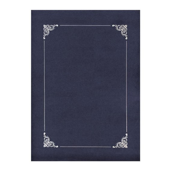 Teczka ozdobna, wymiary 220 x 308mm, gładki karton ze srebrną ramką, cztery wewnętrzne narożniki w rogach przytrzymują arkusz papieru A4, opakowanie 10 sztuk, kolor granatowy,