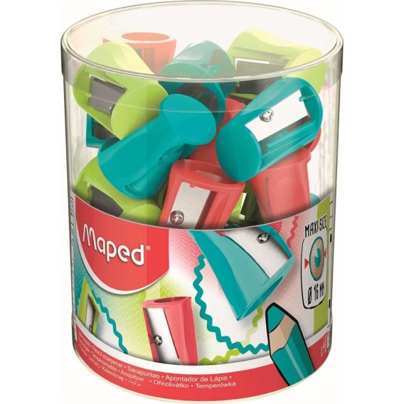 Temperówka VIVO MAXI z jednym otworem o średnicy 17 mm. Dostosowana do temperowania najgrubszych kredek i ołówków o średnicy aż do 16mm. Dostępne w kolorach: niebieski, czerwony i zielony. Display 36 sztuk.