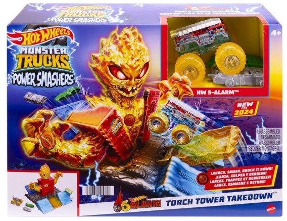 Zawartość: 1 zestaw Hot Wheels(R) Monster Trucks Arena Smashers Wieża ognia wyzwanie, 1 pojazd Hot Wheels(R) Monster Trucks w skali 1:64 i 2 autka do zgniatania.