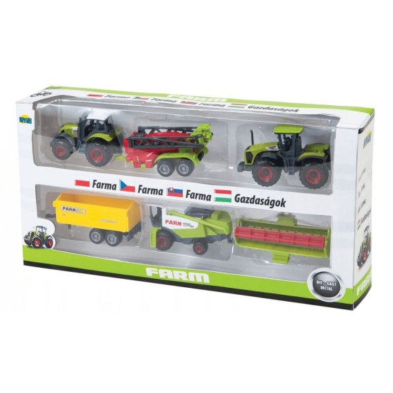 Zestaw traktorków z maszynami rolniczymi w pudełku.Kabiny traktorków i kombajny są wykonane z metalu. W zależności od pory roku trzeba na pole wyjechać z inną maszyną rolniczą. Zabawka przeznaczona dla dzieci powyżej 3 roku życia