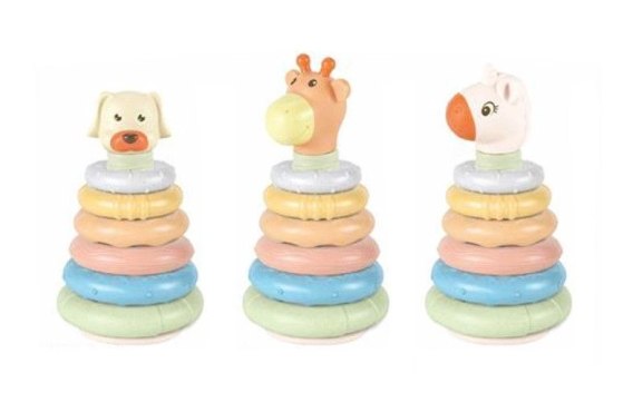 Plastikowa piramidka ze zwierzątkami do układania. Okręgi piramidki mają różne wypustki, co oddziałuje na zmysł dotyku malucha. Zabawka rozwija zdolności motoryczne, sensoryczne i wzrokowe malucha. Piramidki występują w kilku wersjach: piesek, żyrafa, konik. Piramidki wybierane losowo. Cena dotyczy jednej sztuki. Zabawka dla dzieci od 6 miesiąca życia. Produkt zapakowany w siateczkę. Wymiary są przybliżonymi wymiarami zabawki.