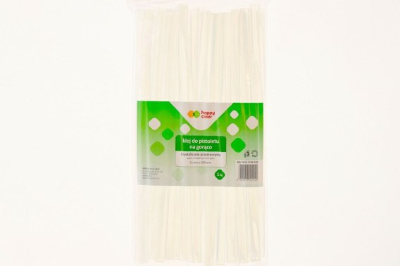 Krystalicznie przezroczysty, również po zaschnięciu, co daje efekt wyjątkowej estetyki wykonanej pracy. Klej w formie lasek, ale i po użyciu nie żółknie, nie zawiera kalafonii.