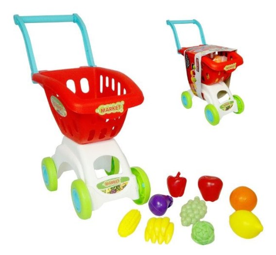 Zabawka wózek marketowy to popularna i edukacyjna zabawa dla dzieci, która rozwija wyobraźnię, zdolności manualne oraz umiejętności społeczne poprzez odgrywanie ról. Wózek imitujący prawdziwy koszyk sklepowy pozwala maluchom naśladować dorosłych podczas codziennych czynności zakupowych. W koszyku znajdują się akcesoria imitujące owoce i warzywa jak: papryka, kapusta, bakłażan, cytryna, banany, pomarańcze, winogrono WYMIARY PRODUKTU: 42x38x18