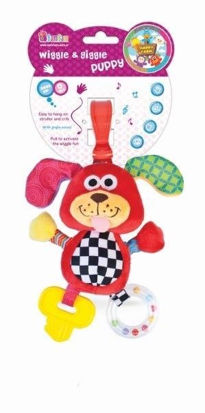 CHICHOCZĄCY PRZYJACIEL PIESEK to przywieszka dla dzieci od urodzenia, wibrująca po pociągnięciu oraz wydająca odgłos śmiechu dziecka. Cechują ją różnorodna tekstura materiałów, intensywne kolory, szeleszczące elementy, pofałdowana powierzchnia, elementy służące do pociągania, elastyczne kółka bądź miękkie gryzaczki, które zachęcą dziecko do zabawy pobudzając jego zmysł dotyku, słuchu i wzroku. Taka kombinacja innowacji rozwojowych stymuluje dziecko do rozwoju percepcji, zmysłów, sprawności ruchowej, motoryki. Wygodny uchwyt umieszczony w zabawce pozwoli na zabranie jej wszędzie ze sobą i umieszczenie w dowolnie wybranym miejscu: wózek, łóżeczko, nosidełko-fotelik samochodowy, jak również zamiennie do maty edukacyjnej.