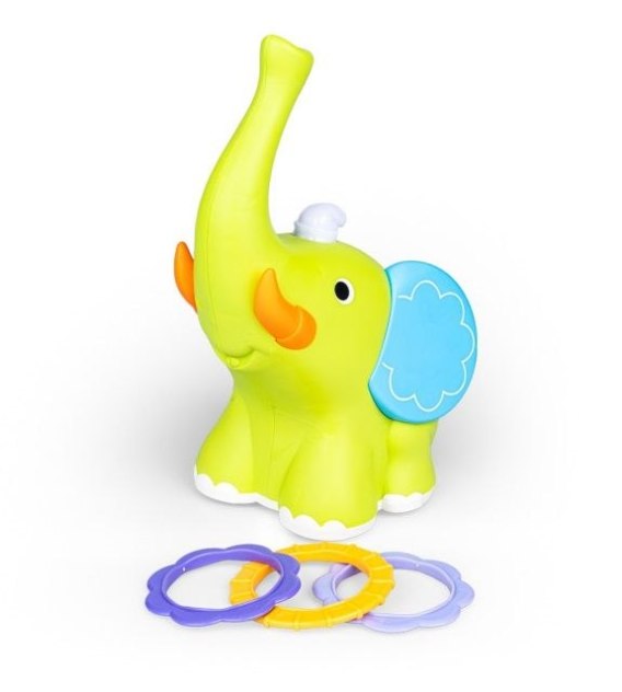 Razem ze Słonikiem ćwicz celność i przekonaj się czy jesteś zwinniejszy od niego! Zabawa polega na wrzuceniu wprost na słoniową trąbę kolorowych obręczy, które znajdują się w zestawie. Żeby nie było tak łatwo, cel jest ruchomy, gdyż słonik przemieszcza się, jeżdżąc we wszystkich kierunkach. Naciśnij na czapeczkę słonika, słuchaj piosenki w języku polskim i... trenuj rzuty! Figlarny Słonik przeznaczony jest dla dzieci od 12 miesiąca życia. Cechy zabawki: - zabawka śpiewa w języku polskim - w zestawie obręcze - zabawa polega na wrzuceniu obręczy na trąbę słonika, który jeździ we wszystkich kierunkach - wiek: od 12 miesiąca życia