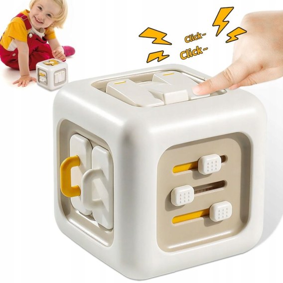Funkcje: 6 boków z elementami manipulacyjnymi - obracany wiatraczek, 3 przyciski włącznika, 3 suwaki z terkotką, gałka do obracania, wysuwana szufladka, lusterko z 4 przyciskami, Pozostałe informacje: wym. kostki: 8,5 x 8,5 x 8,5 cm., 12M+