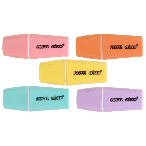 Display słoik z mini zakreślaczami Cricco w delikatnych, pastelowych kolorach: niebieskim, różowym, pomarańczowym, żółtym i fioletowym. Doskonałe przy nauce i robieniu notatek. Kompaktowy rozmiar sprawia, że zmieszczą się w każdym piórniku czy kieszeni. Ścięta końcówka i wygodny kształt dla komfortowego używania.