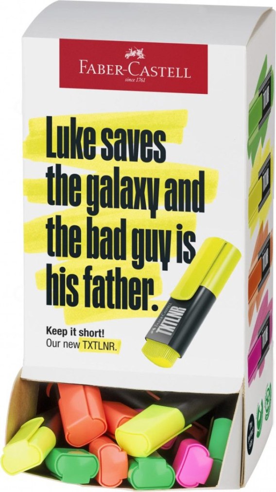 Display z zakreślaczami min TXTLNR Faber-Castell 60 szt. mix kolorów neonowych od Faber-Castell. Wysokiej jakości superfluorescencyjne kolory, idealne do zaznaczania, podkreślania i wyróżniania. Odpowiednie do wszystkich rodzajów papierów. Uniwersalny tusz na bazie wody. Odporne na rozmazywanie. Ze ściętą końcówką o szerokości linii pisania 1 - 5 mm. Dostępne w różnych kolorach i zestawach.