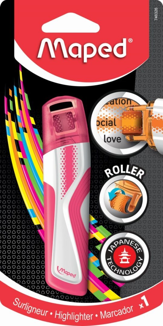 ROLLER FLUO'PEPS - zakreślanie ze wzorem. Produkt łączący funkcje pieczątki i zakreślacza. Niezawodny w użytkowaniu. Rolka pracuje cicho, płynnie, nie powoduje tarcia na papierze, działa w dwie strony. Intensywne kolory, tusz odporny na działanie światła, nietoksyczny. Lekko wygiety, klasyczny kształt obudowy. Nadaje się do wszystkich rodzajów papieru. Dostępny w pięciu kolorach. Kolor różowy. J.S.: 1 blister.