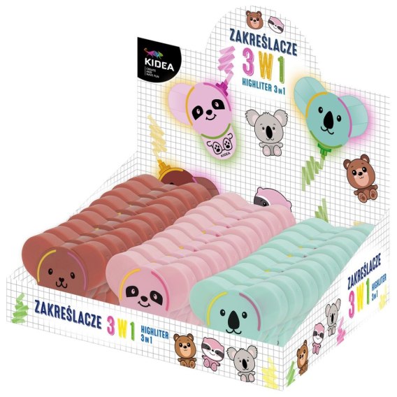Zakreślacze 3w1 Kidea. W jednym zakreślaczu ze zwierzakiem - misiem, koalą lub leniwcem skrywają się aż trzy kolory neonowych końcówek: żółty, zielony i różowy. Z pewnością docenią je wielbiciele pomysłowych i minimalistycznych rozwiązań, którzy nie lubią nosić zbyt dużo w piórniku, a którzy wziąż chcą mieć najpotrzebniejsze przybory pod ręką. Kolorowe zakreślacze sprawdzą się podczas sporządzania notatek, zaznaczania ważnych zagadnień w trakcie nauki czy podkreślania tematów lekcji.