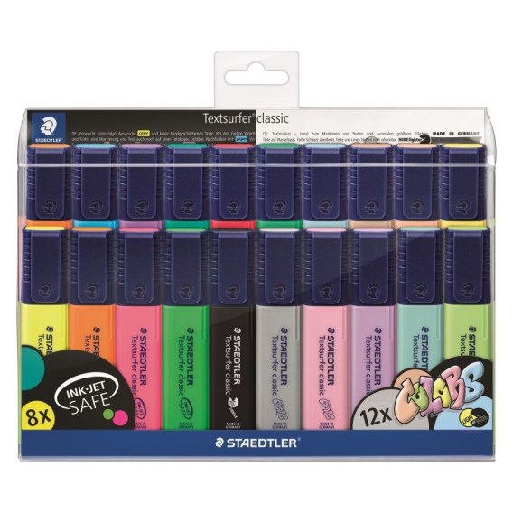 Do papieru, kserokopii i faksu. Nieblaknący atrament pigmentowy na bazie wody, szybkoschnący (2-4 sek.). Spieralny z większości tekstyliów. INKJET SAFE – wszystkie kolory nie rozmazują wydruków atramentowych i nie pozostawiają smug. COPY PROOF - kolory fioletowy i turkusowy gwarantują wyraźną widoczność zarówno zakreślenia jak i zakreślanego tekstu na kserokopiach. Może być używany podczas lotu samolotem – automatyczne wyrównywanie się ciśnienia chroni pisak przed wylaniem atramentu. Grubość linii zakreślenia: 1-5 mm. Długość linii zakreślenia 330 m. 10 szt. w opak., 500 szt. w kartonie.