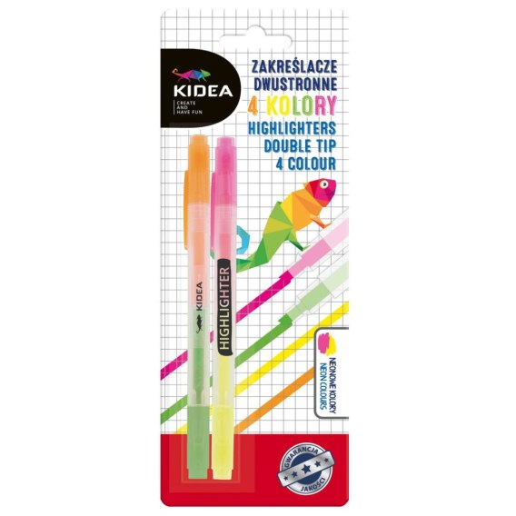Zestaw 2 zakreślaczy w dwustronnych pisakach, to aż 4 kolory fluorescencyjne - żółty, różowy, pomarańczowy i zielony. Doskonale posłużą do oznaczania ważnych informacji i sprawią, że notatki staną się bardziej przejrzyste.