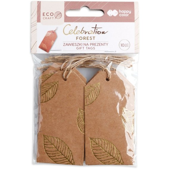 Eleganckie zawieszki na prezenty z brązowego papieru kraftowego z wytłoczonymi złotymi liśćmi. Możliwość dopisywania dedykacji. Każda zawieszka posiada sznureczek w kolorze naturalnym. Kształt – prostokątny. Wymiar – 8 x 4 cm. Sznureczek – naturalny. Ilość w opakowaniu – 10 szt.
