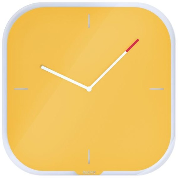 Nowoczesny i minimalistyczny, cichy, nietykający zegar ścienny. Wykonany ze szkła. Z dołączonym markerem do pisania na tarczy. Wymiary: 300 x 40 x 300 mm. Żółty.