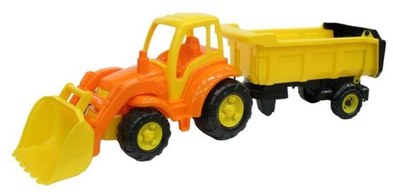 Traktor z łyżką i naczepą MAJSTER to klasyczny pojazd na czterech szerokich, dużych kołach. Ich struktura jest nierówna, by mógł pokonywać różne rodzaje podłoża. Kabina traktorzysty jest przestronna. Z pewnością zmieści się w niej figurka ulubionego bohatera. Na przedniej części traktora umieszczono łyżkę. Ona sama jak i ramię, na którym się znajduje są ruchome. Pozwala to na precyzyjne nabieranie materiału. Oprócz tego dołączono przyczepę. Posiada ona burty, z których tylną można otworzyć.