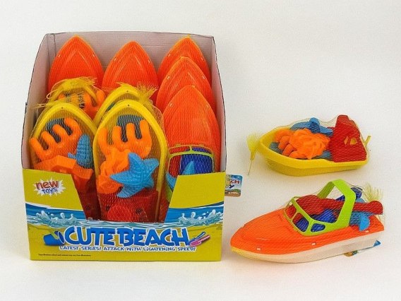 Zabawki do piasku 5 części, łódka 25x12x10cm z foremkami, łopatka i grabki, display 12szt; 37x33,5x25cm, Box