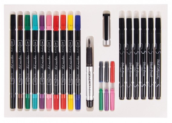 Piękny zestaw do KREATYWNEGO tworzenia zawierający 23 elementy. W środku znajduje się: pióro wieczne z irydową stalówką oraz 6 kolorowych naboi atramentowych. Ponadto 10 kolorowych markerów artystycznych, dwustronnych z cienką oraz pędzelkową końcówką. Dodatkowo znajdziesz w nim 6 nowoczesnych czarnych pisaków do kaligrafii, letteringu czy szkicowania, każdy z inną specjalnie dobraną końcówką: 0,3mm; 0,5mm; 0,7mm; 1,00mm; ścięta - Calligraphy; pędzelkowa Brush. A wszystko to zapakowane w eleganckie pudełko - idealny pomysł na prezent.