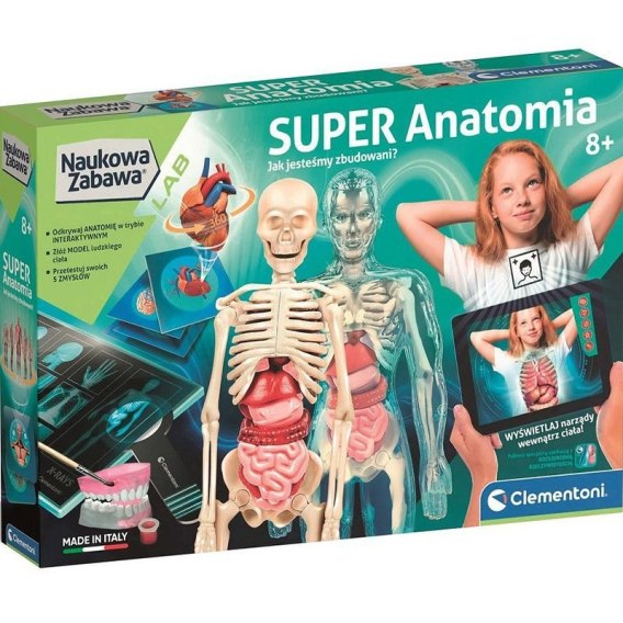Super Anatomia pozwala odkrywać fascynujący świat Ludzkiego Ciała! Zestaw Super Anatomia to ekscytująca podróż do wnętrza ludzkiego ciała, która przenosi naukę na zupełnie nowy poziom. Wyobraź sobie, jak Twoje dziecko odkrywa sekrety anatomii, ucząc się w interaktywny i wciągający sposób. Zestaw Clementoni Naukowa Zabawa Super Anatomia to naukowa przygoda, w której młodzi badacze mogą własnoręcznie złożyć realistyczny model ciała ludzkiego - od szkieletu, przez narządy wewnętrzne, aż po łuki zębowe. W trakcie zabawy dzieci poznają, jak działają ich zmysły i jak współpracują różne części ciała. To jednak nie wszystko! Zestaw Super Anatomia oferuje dodatkowo interaktywną aplikację z rozszerzoną rzeczywistością (AR), która umożliwia dogłębne poznawanie organów. Dzięki temu dzieci mogą zobaczyć narządy wewnętrzne w trójwymiarze, a aplikacja pełna ciekawostek i informacji naukowych pogłębi ich wiedzę. Zestaw Super Anatomia to doskonała zabawa edukacyjna, która rozwija wiedzę o ciele, zdolności manualne i ciekawość świata, zamieniając naukę w pełną przygód zabawę!