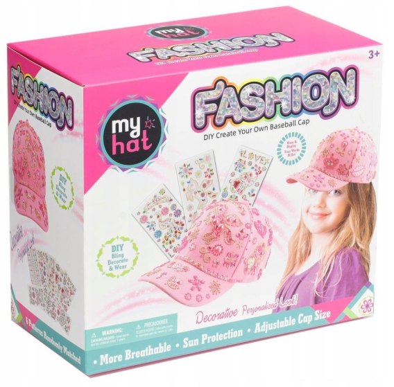 W zestawie znajduje się czapka z daszkiem którą można ozdobić. Wykorzystaj akcesoria ozdobne i stwórz swoją własną i niepowtarzalną czapkę! Nie potrzeba kleju , naklejki gotowe do użycia .