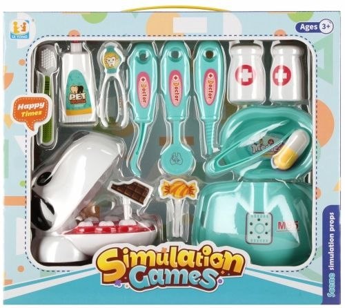 Zalety produktu: Rozwijanie wyobraźni dziecka, rozwijanie pasji, nauka dbania o zdrowie jamy ustnej. Dzieci marzą aby w przyszłości wykonywać potrzebny i szanowany zawód Dentysty. Pozwól mu już teraz przygotować się do tej roli i poznać wszystkie aspekty pracy w służbie zdrowia. Z Zestawem MEGA CREATIVE dziecko będzie mogło pomóc swojemu pierwszemu pacjentowi! Zawartość zestawu: jama ustna psa, pasta i szczoteczka do zębów, termometr, lusterko dentystyczne, irygator ,pęseta, miseczka na naczynia dentystyczne, narzędzia dentystyczne. Całość wykonana z plastiku i kartonu. Wymiary/waga/baterie: wymiary produktu (dł. x wys. x gł.)[cm]: 10x9x8 , wymiar opakowania (dł. x wys. x gł.) [cm]: 27x23x8, waga produktu bez opakowania [kg]: 0,09 kg, waga produktu w opakowaniu [kg]: 0, 24 kg, nie wymaga zasilania bateriami. Zestaw przeznaczony dla dzieci w wieku: 3+. Pakowany w kartonik z okienkiem. W kartonie po 30 szt.