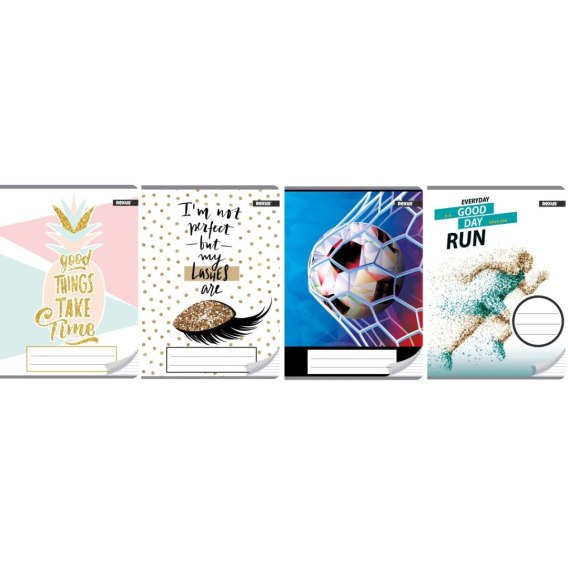 Zeszyt formatu A5. Ilość kartek 60, liniatura linia. Okładka pokryta lakierem uv oraz punktowo metalizowana, zadruk kolorowy. Wysokość:21cm Szerokość: 14,7 cm. Dwa wzory